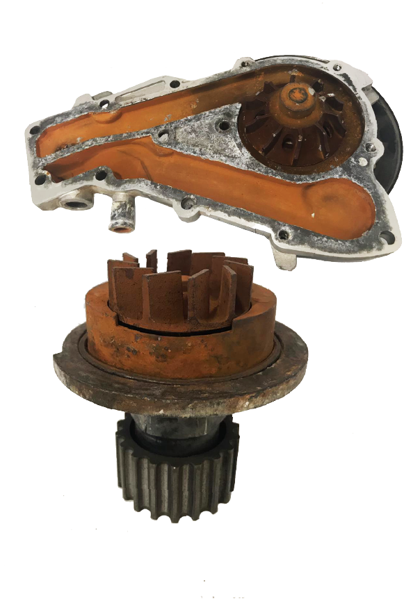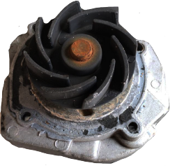 El aluminio no forma una capa de óxido color rojiza (como si sucede en los materailes ferrosos). La presencia de este color indica que el circuito para circulación del líquido, y hasta el líquido mismo, contenían partículas de óxido, que pueden dañar el sello de la bomba de agua. La garantia no debe aceptarse porque la bomba de agua no se encontraba en un medio acorde para garantizar su correcto funcionamiento.