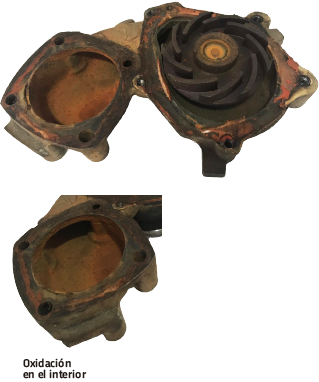 Los materiales ferrosos presentan una tendencia natural a la oxidación, por ello deben protegerse adecuadamente; por ejemplo utilizando liquido refrigerante con las proporciones adecuadas de agua desmineralizada y refrigerante. Una bomba de agua en período de garantia con marcas de óxido no debe aceptarse, pues es indicio de que la misma no se encontraba en un medio acorde para garantizar su correcto funcionamiento.