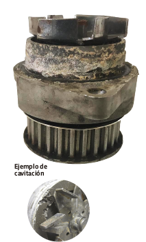 La cavitación es un fenomeno ocasionado a partir de la presencia de burbujas de vapor en la masa líquido refrigerante. Cuando las mismas llegan al punto de máxima presión (es decir en la zona donde se encuentra la turbina), implotan generando ondas de choque que impactan y percuten el material hasta desintegrarlo. El material afectado por efecto de cavitación suele ser el mas próximo a la turbina, incluyendo a esta última